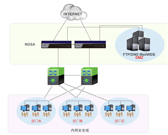 在仔细分析了该统计局的网络结构后,替换下原有的传统防火墙和IPS等设备,将两台任子行下一代防火墙双机部署在网络出口处,保证局内网络的高可用性,避免由于单台设备故障而造成的业务中断等影响。