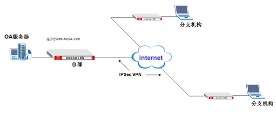 总部需要使用带有固定IP地址的光纤接入互联网,各个分支点可以使用ADSL或者光纤的方式接入互联网,移动用户接入方式不限。分支机构和移动用户通过各自的VPN设备建立VPN安全隧道,在隧道中进行数据传递。