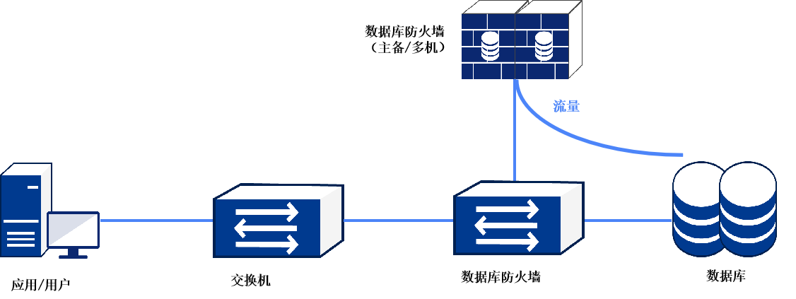 通过“物理旁路、逻辑串行”的方式部署。网络上并联接入防火墙设备,客户端连接防火墙的设备地址,并将通讯包发送至防火墙设备,再经过内部策略分析后完成客户端与数据库的交互过程。