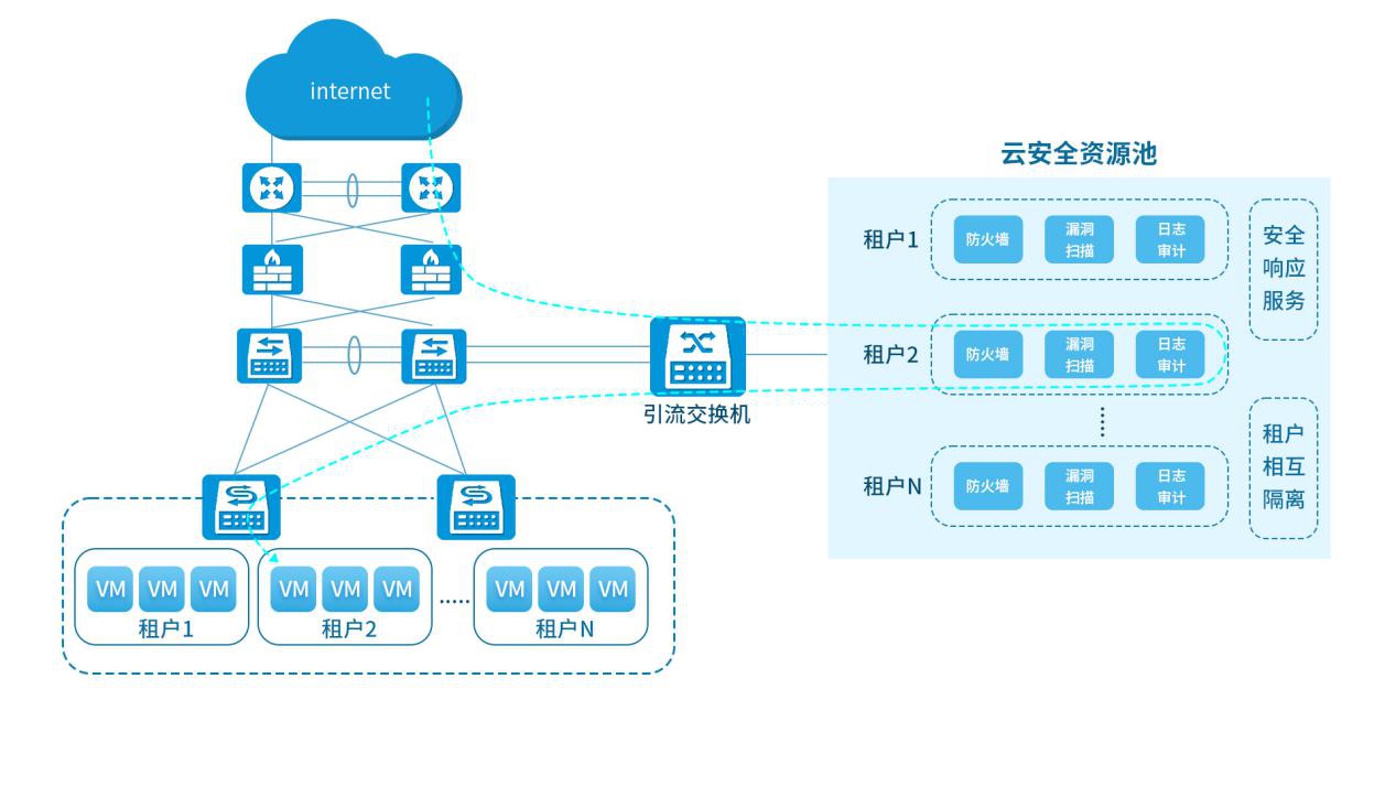 随着云计算从概念到趋势,企业上云计划逐步实现而传统IT行业慢慢过渡到云计算大数据时代,而安全问题也随之带来了新挑战。任子行云安全解决方案基于软件定义安全技术,以服务化形式向客户提供丰富的安全资源,解决安全需求多样化、安全运维复杂、安全投入产出不成正比的需求,主要通过把虚拟机流量牵引到云池中进行流量清洗,从而实现安全保障。